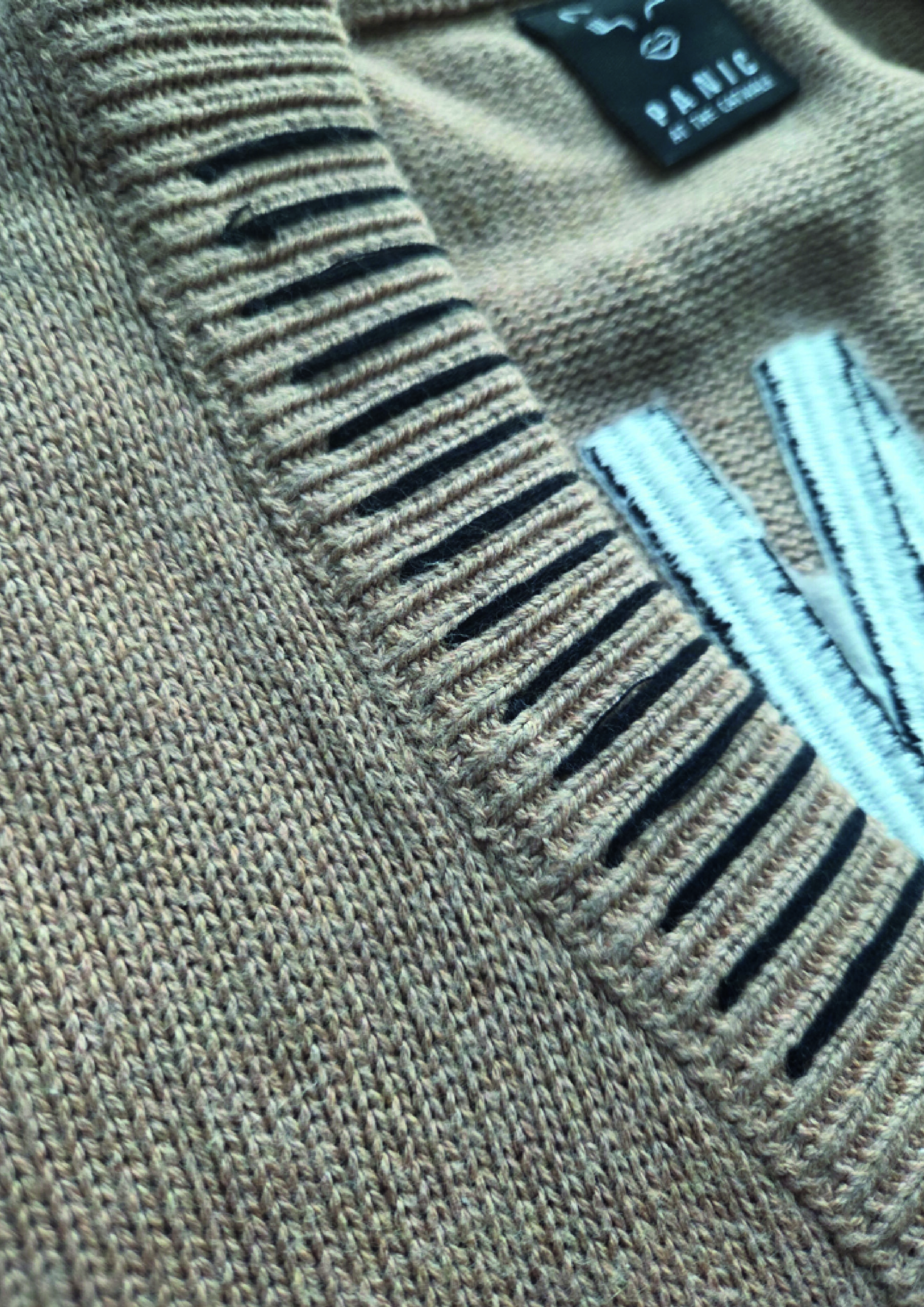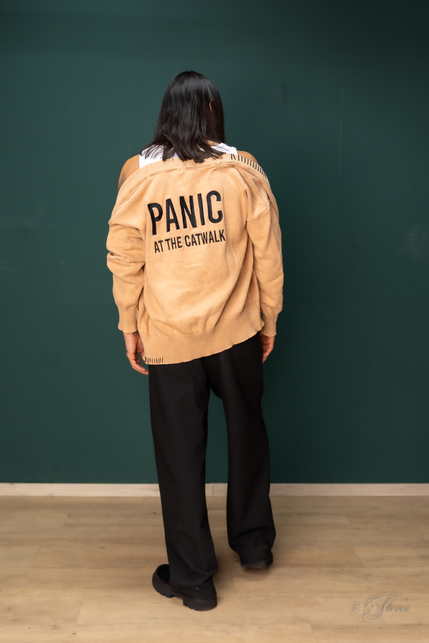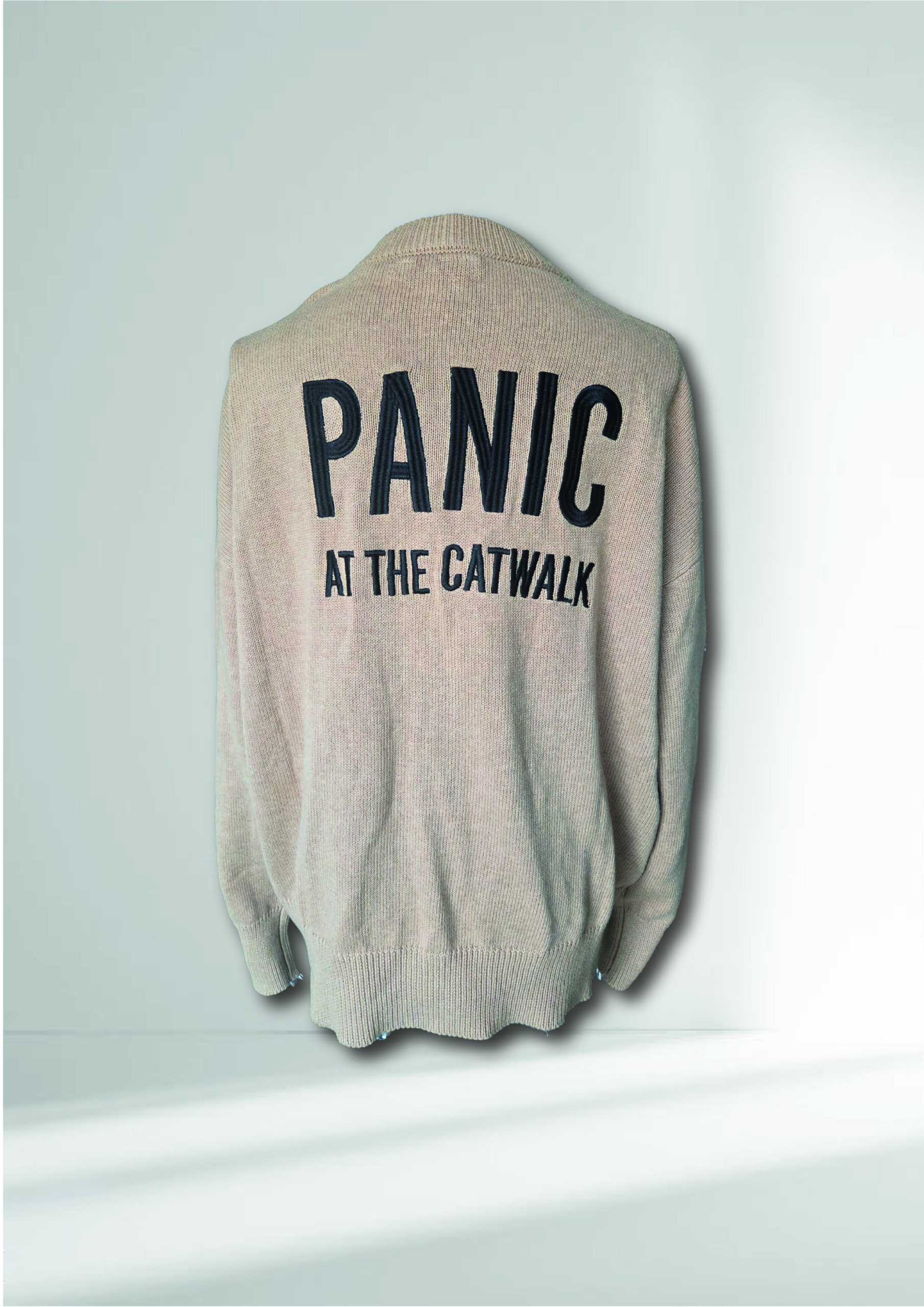 Unisex Cardigan mit PANIC AT THE CATWALK -Stickerei auf dem Rücken und Handstickerei an Saumkanten