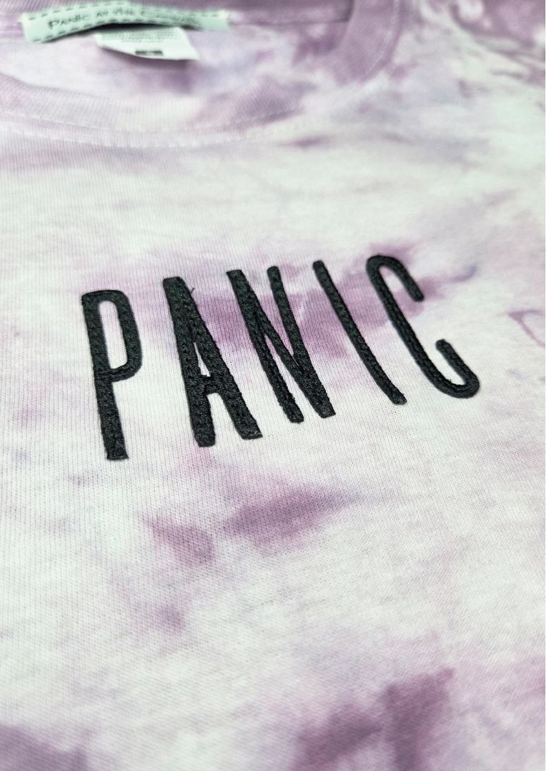 Ladies-T-Shirt mit handgefärbtem Batikmuster und kleiner PANIC Applikation auf der Brust