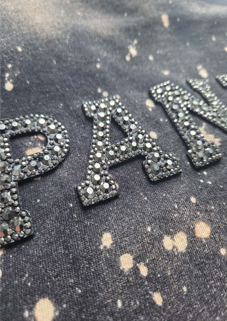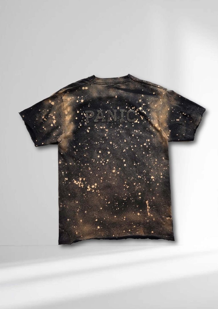 Unisex T-Shirt mit handgefertigtem Bleichmuster und PANIC Strass-Applikation auf dem Rücken und geschnittenen Kanten an Body und Ärmelsaum.