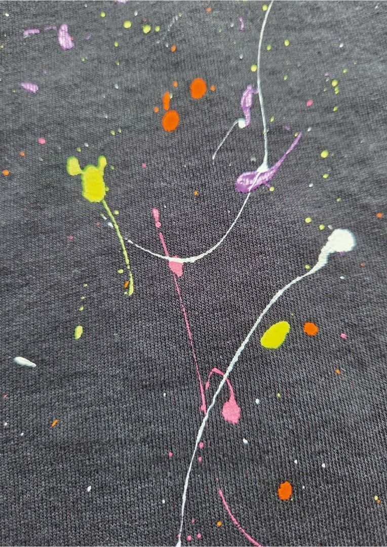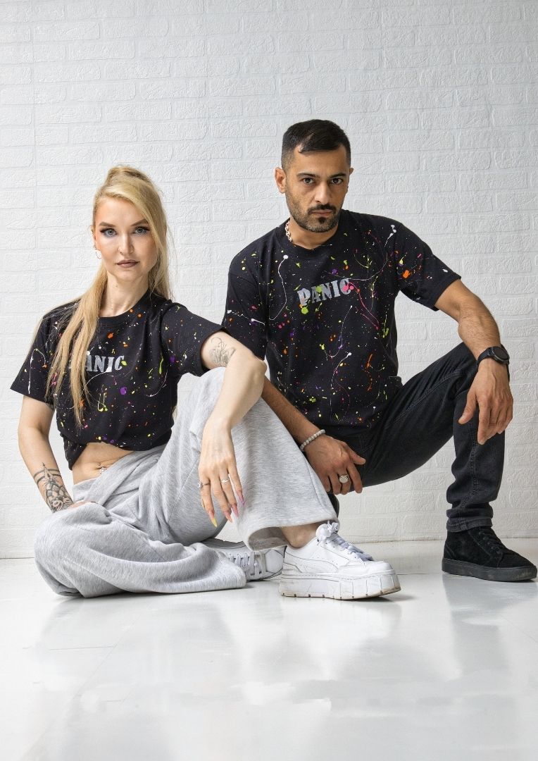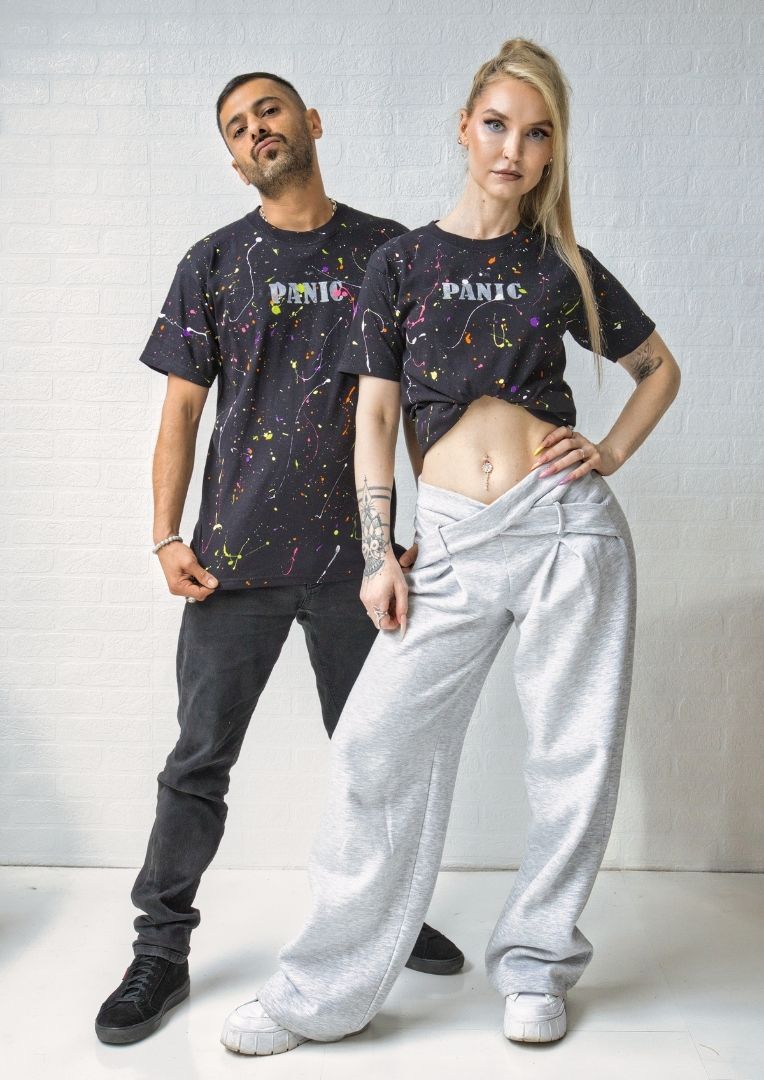 Unisex T-Shirt mit bunten Farbspritzern und kleinem PANIC Print auf der Brust